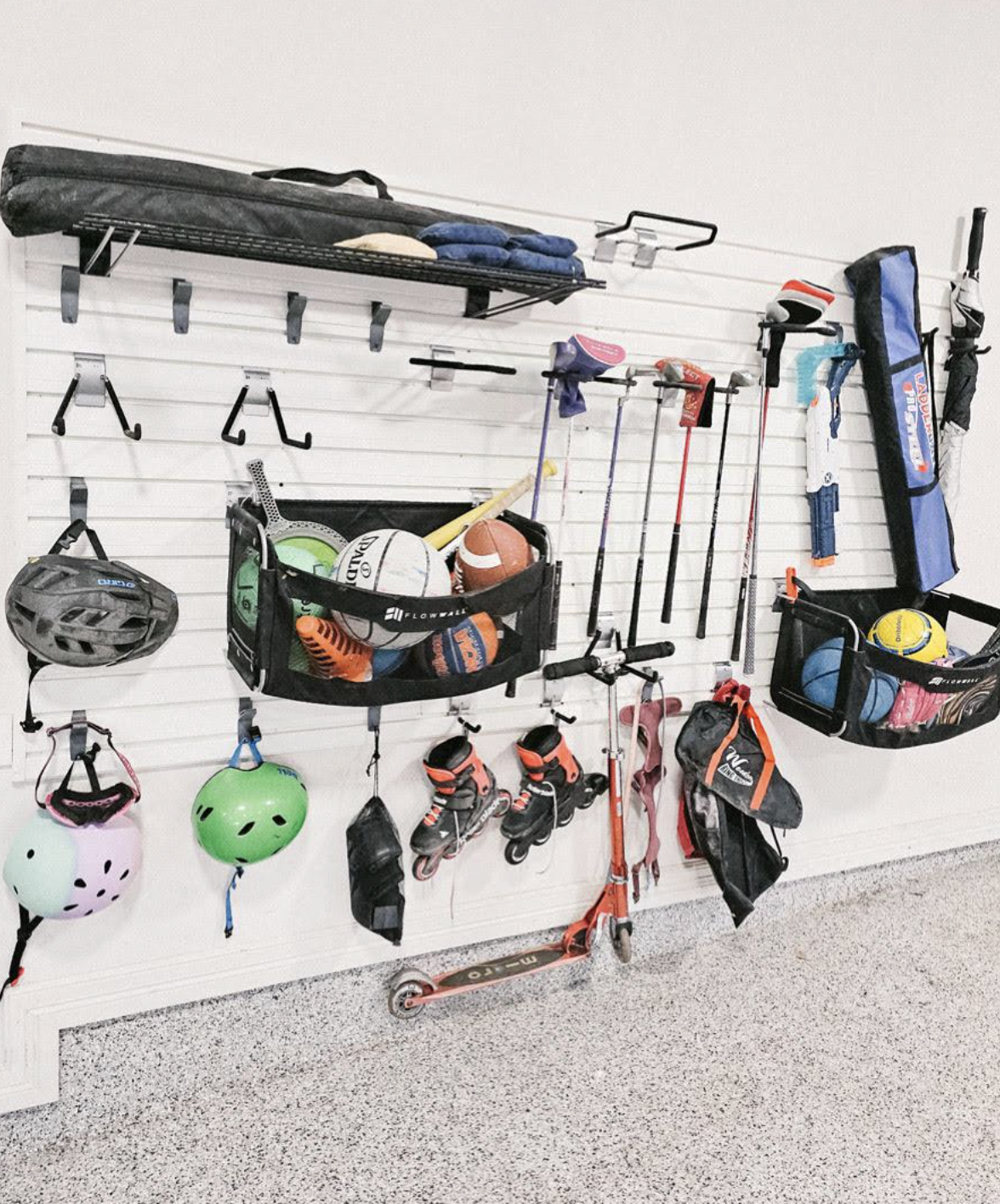 Slat walls can be added in addition to our Elfa systems, shelving units, and matching storage tubs to enhance your garage organization. They allow you to easily hang hooks, shelves, and bins for tools, sports gear, garden tools, and more, maximizing vertical space and keeping everything accessible.