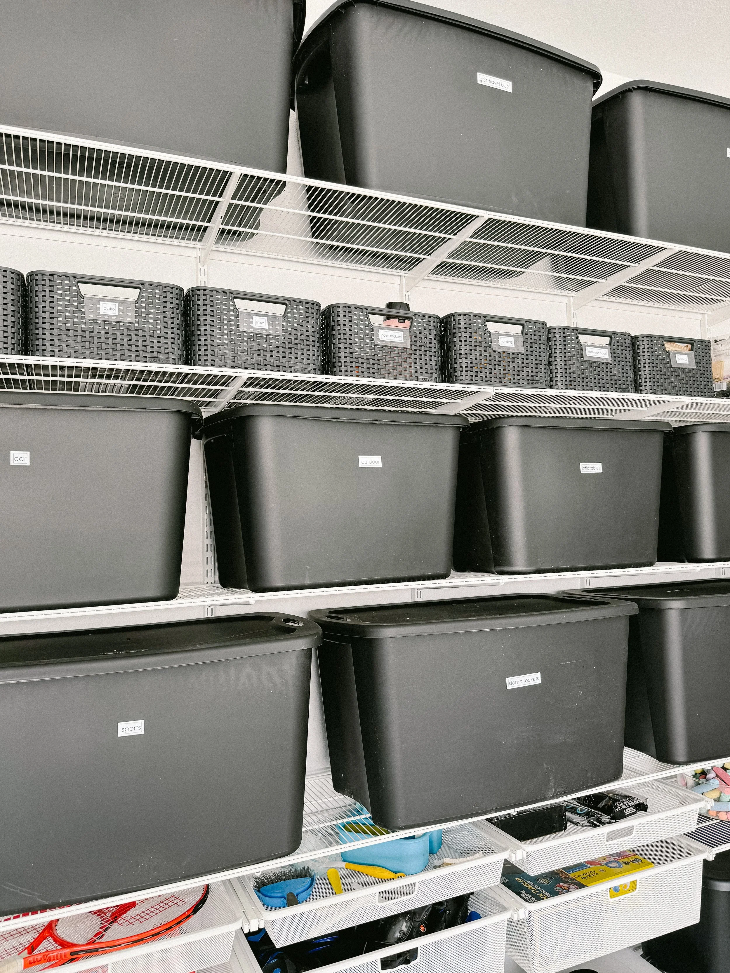 If you aren't ready to commit to mounted systems like Elfa or Inspired Closets, we can use shelving units and matching storage tubs to create a clean, organized system for your garage. Each tub is clearly labeled with its contents, making it easy to find what you need without the clutter. This simple approach not only keeps everything neatly stored, but also gives your space a streamlined, cohesive look.